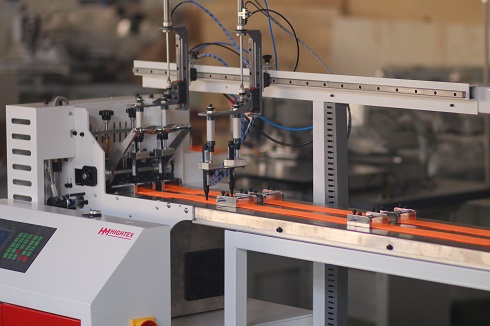 La máquina corta automáticamente cinta y marca su posición para coser posteriormente. Construido y diseñado para la producción eficiente de cintas de amarre, eslingas de izaje, arnés de seguridad y correas militares.