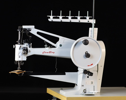 Máquina ribeteadora triple arrastre con brazo cilíndrico ideal para el trabajo pesado en orillas o ribetes de zapatos, alfombras, tapetes, bolsos, carteras y marroquinería en general. Un bello acabado de unión de cinta para materiales pesados o cinta elástica puede fácilmente y sin problemas realizarse.